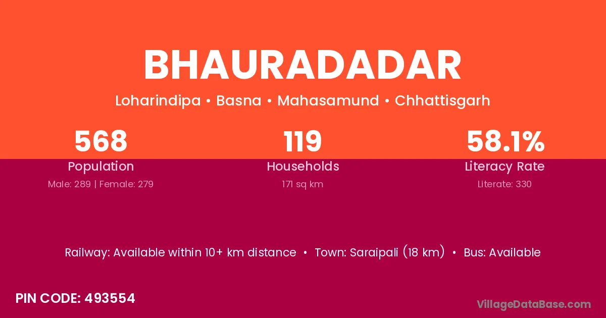 Saraipali (18 km) is the nearest town to Bhauradadar village for major economic activities and is located approximately 18 km away.