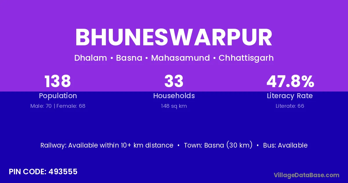 Basna (30 km) is the nearest town to Bhuneswarpur village for major economic activities and is located approximately 30 km away.