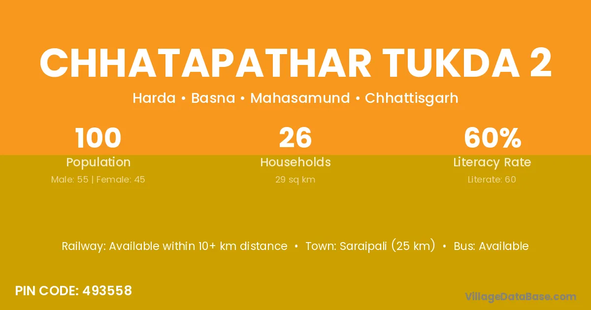 Saraipali (25 km) is the nearest town to Chhatapathar Tukda 2 village for major economic activities and is located approximately 25 km away.