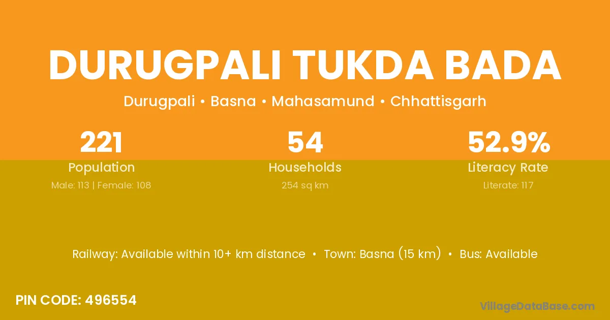 Durugpali Tukda Bada village has a total population of 221 people, of which 113 are males and 108 are females.