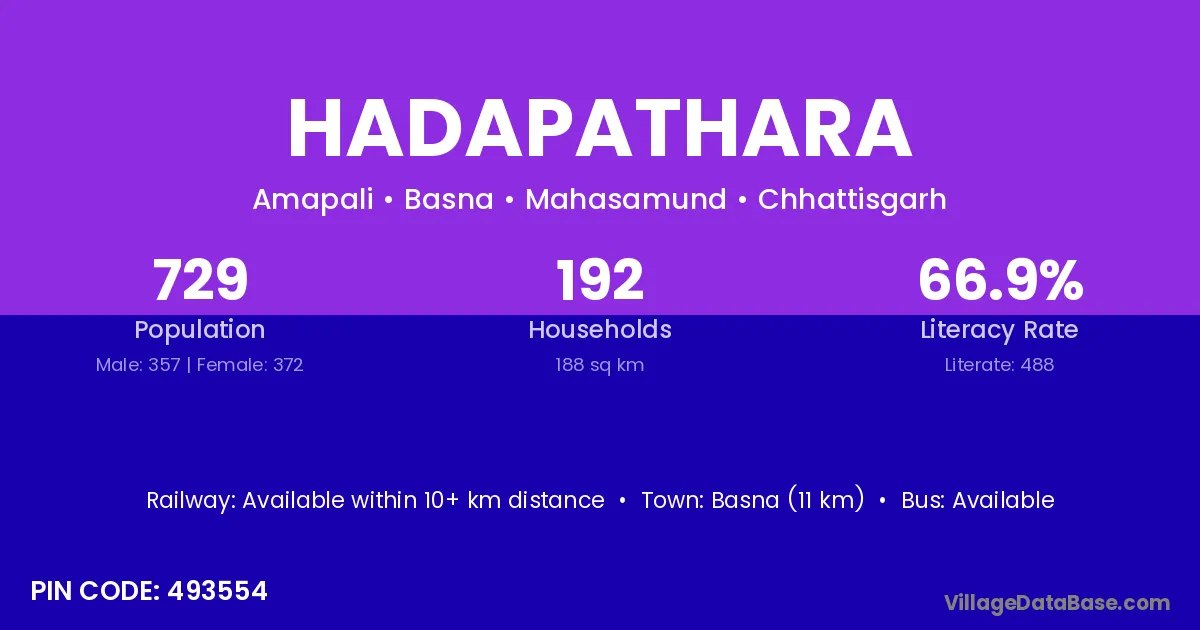 Basna (11 km) is the nearest town to Hadapathara village for major economic activities and is located approximately 11 km away.