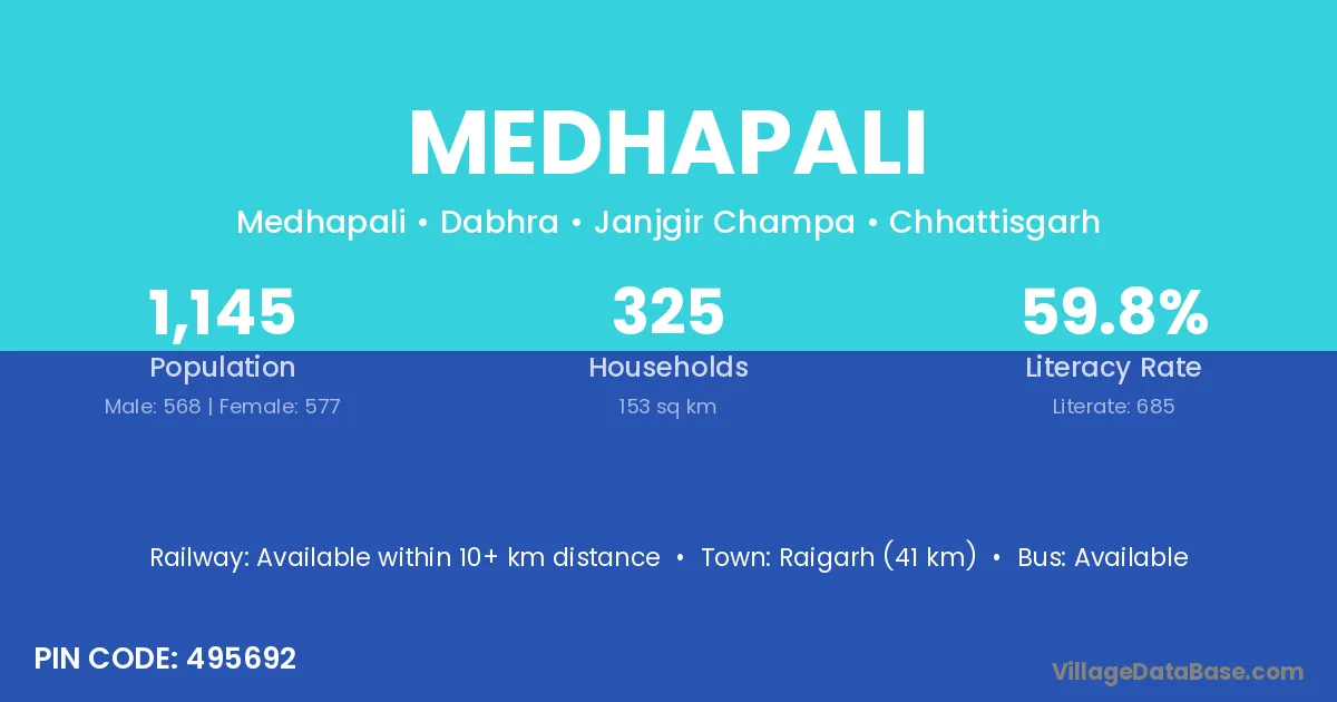 According to Census 2011 information, the village code of Medhapali village is 493558.