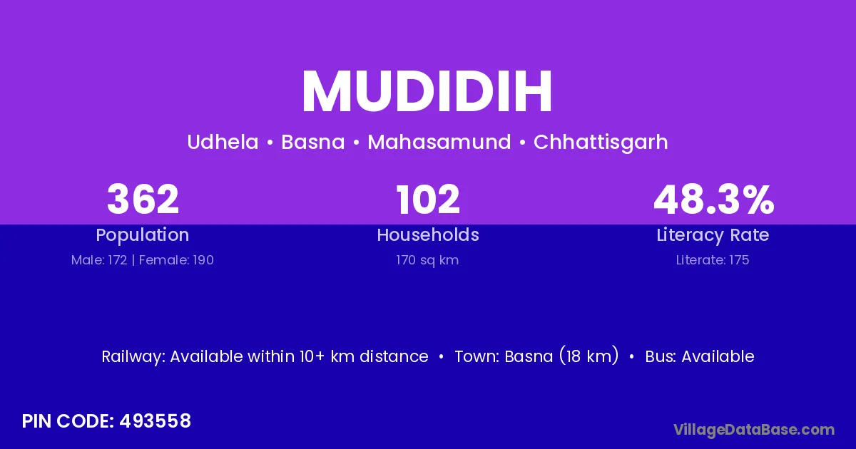 Basna (18 km) is the nearest town to Mudidih village for major economic activities and is located approximately 18 km away.