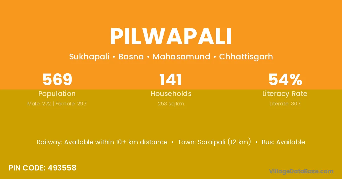 Saraipali (12 km) is the nearest town to Pilwapali village for major economic activities and is located approximately 12 km away.