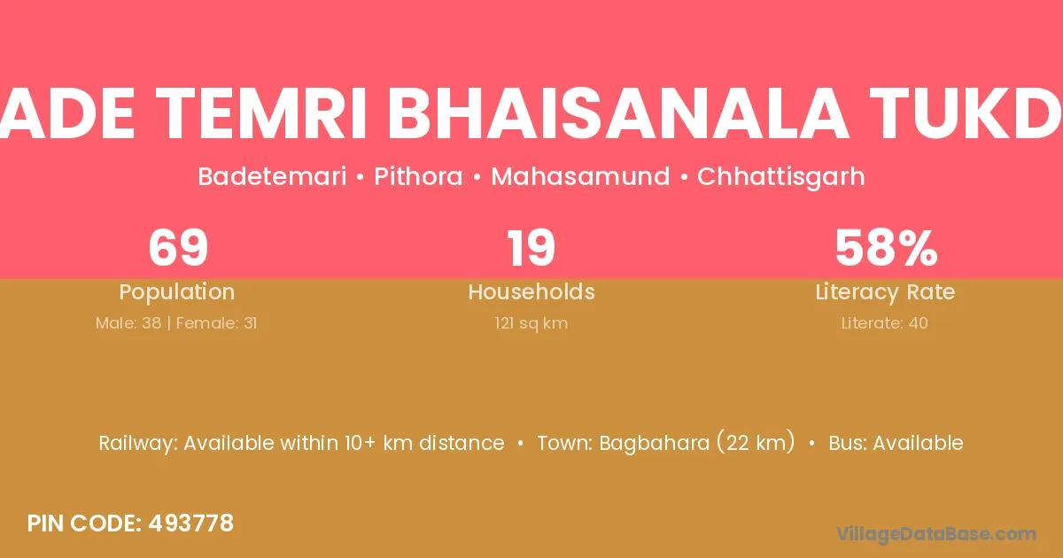 Bade Temri Bhaisanala Tukda village has a total population of 69 people, of which 38 are males and 31 are females.
