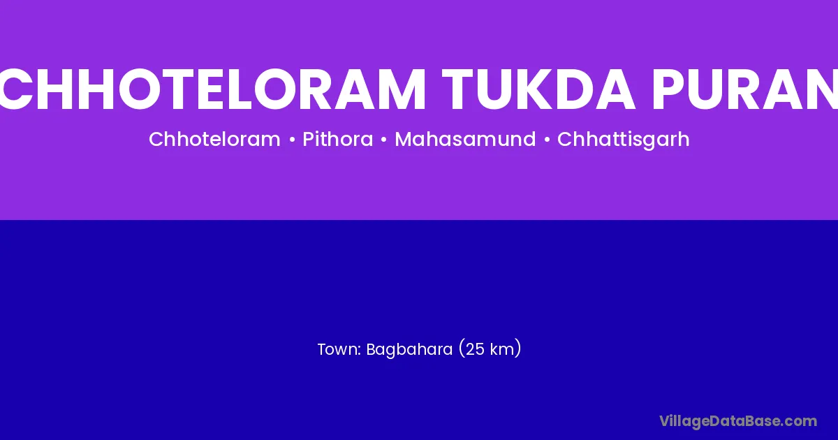Bagbahara (25 km) is the nearest town to Chhoteloram Tukda Puran village for major economic activities and is located approximately 25 km away.