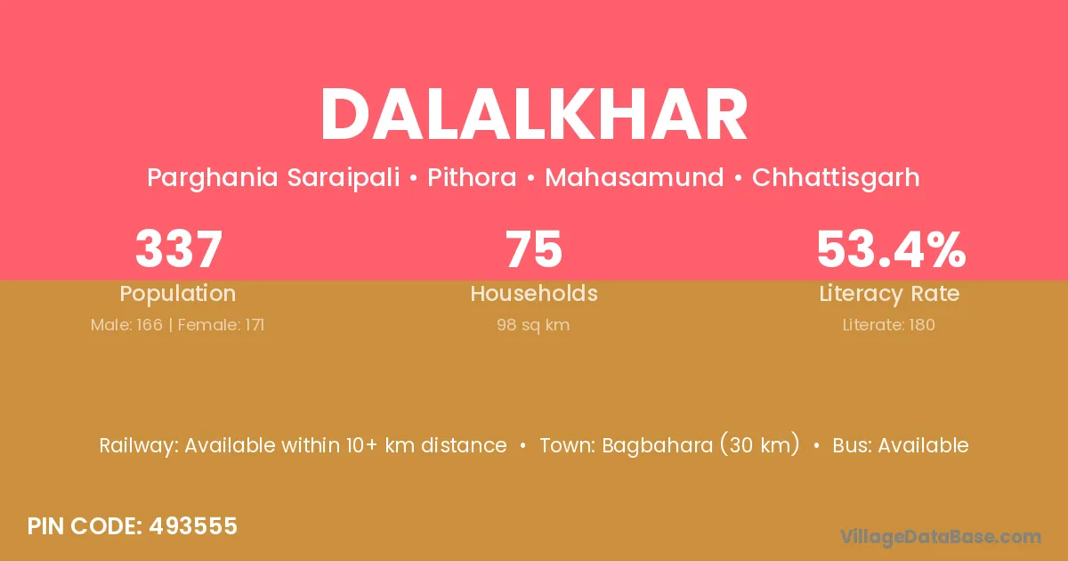Bagbahara (30 km) is the nearest town to Dalalkhar village for major economic activities and is located approximately 30 km away.