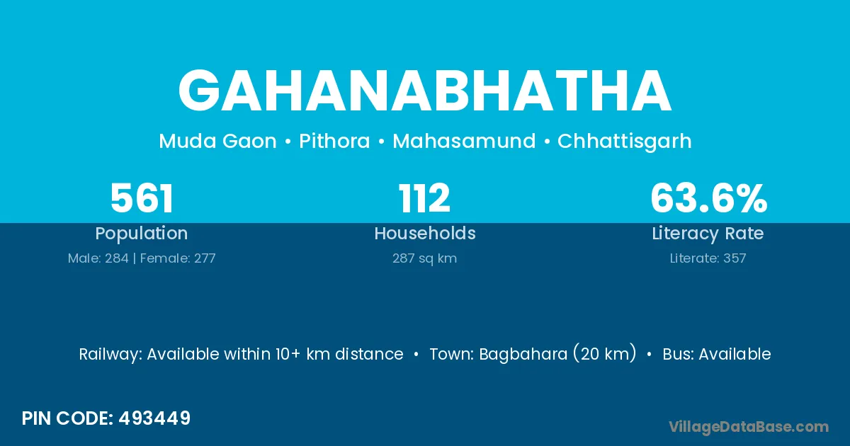 Gahanabhatha village has a total population of 561 people, of which 284 are males and 277 are females.