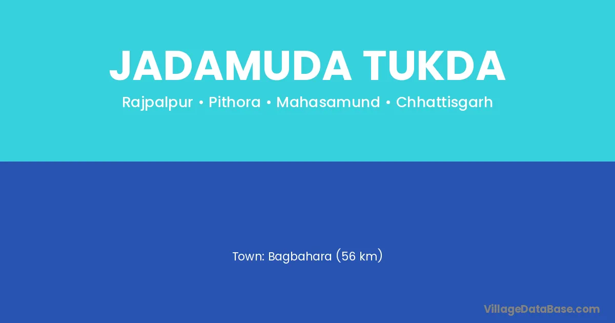 Bagbahara (56 km) is the nearest town to Jadamuda Tukda village for major economic activities and is located approximately 56 km away.