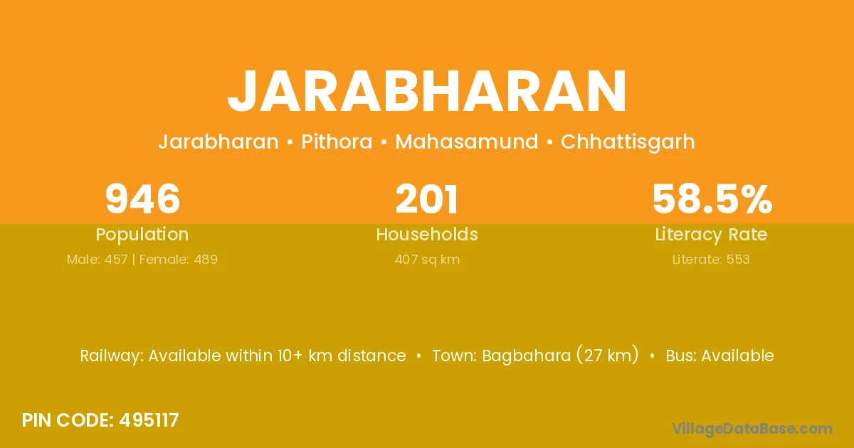 Jarabharan village has a total population of 946 people, of which 457 are males and 489 are females.