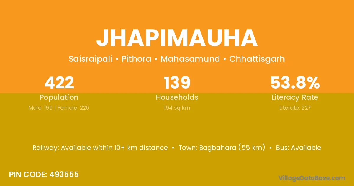 Bagbahara (55 km) is the nearest town to Jhapimauha village for major economic activities and is located approximately 55 km away.