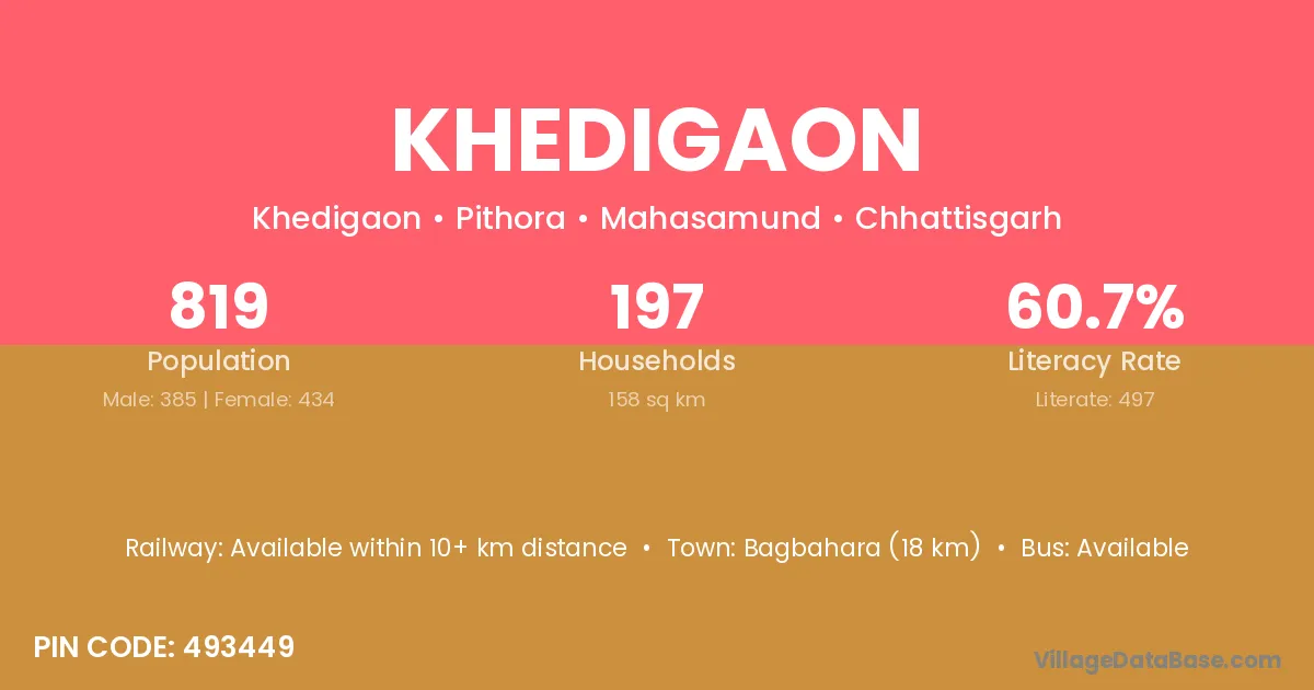 Bagbahara (18 km) is the nearest town to Khedigaon village for major economic activities and is located approximately 18 km away.