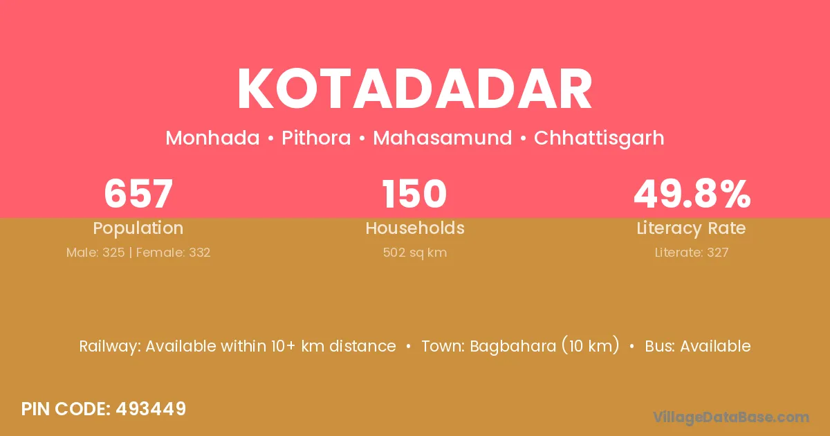 Kotadadar village has a total population of 657 people, of which 325 are males and 332 are females.