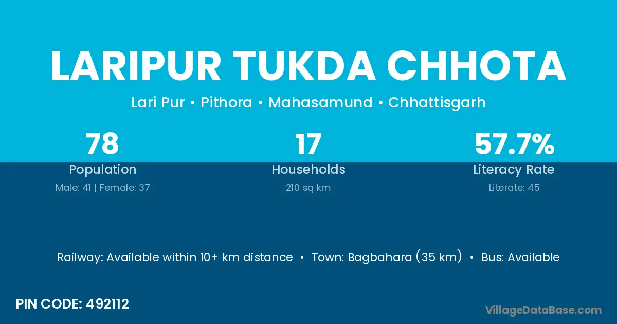 Laripur Tukda Chhota village is located in the Pithora Tehsil of the Mahasamund district in Chhattisgarh .