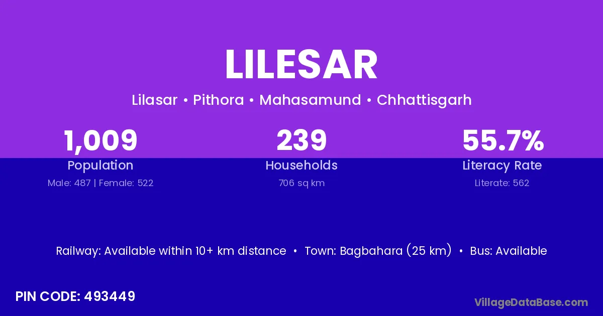 Bagbahara (25 km) is the nearest town to Lilesar village for major economic activities and is located approximately 25 km away.
