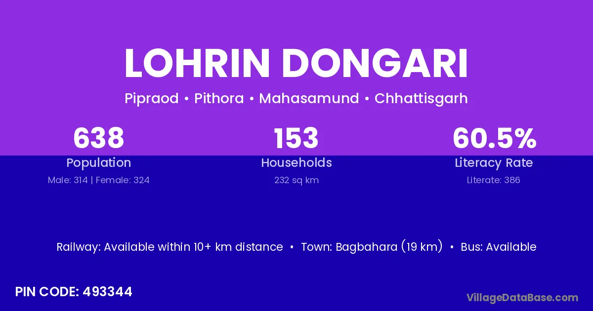 Bagbahara (19 km) is the nearest town to Lohrin Dongari village for major economic activities and is located approximately 19 km away.