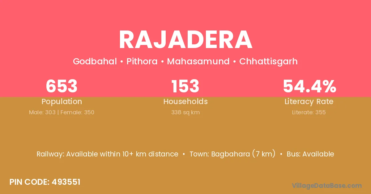 Bagbahara (7 km) is the nearest town to Rajadera village for major economic activities and is located approximately 7 km away.