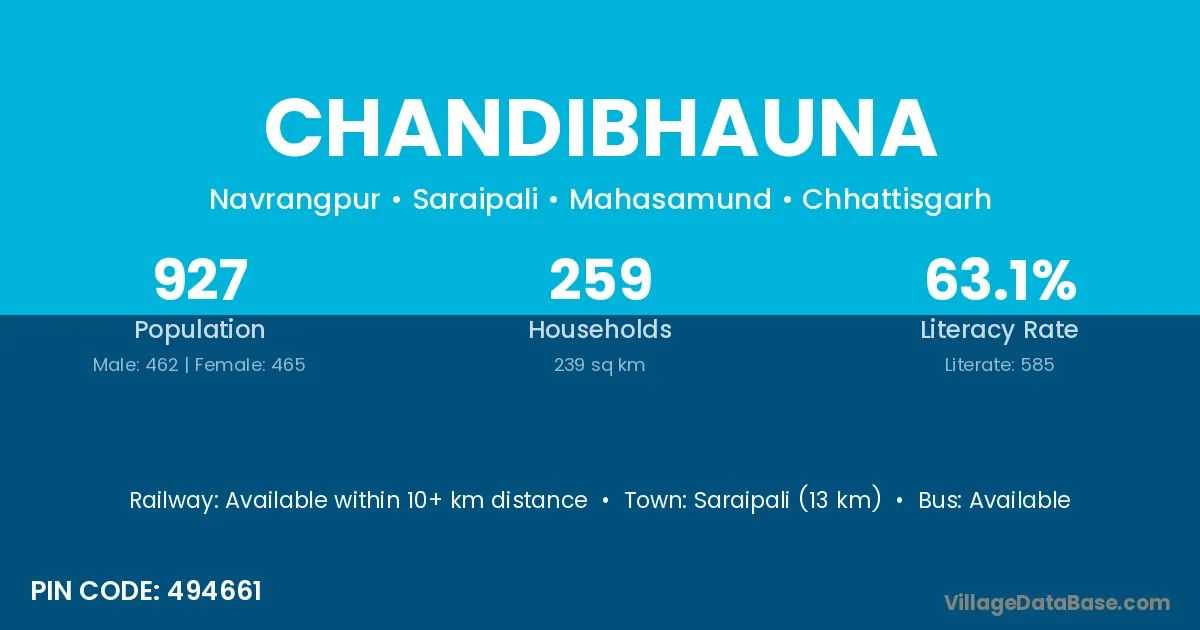 Saraipali (13 km) is the nearest town to Chandibhauna village for major economic activities and is located approximately 13 km away.