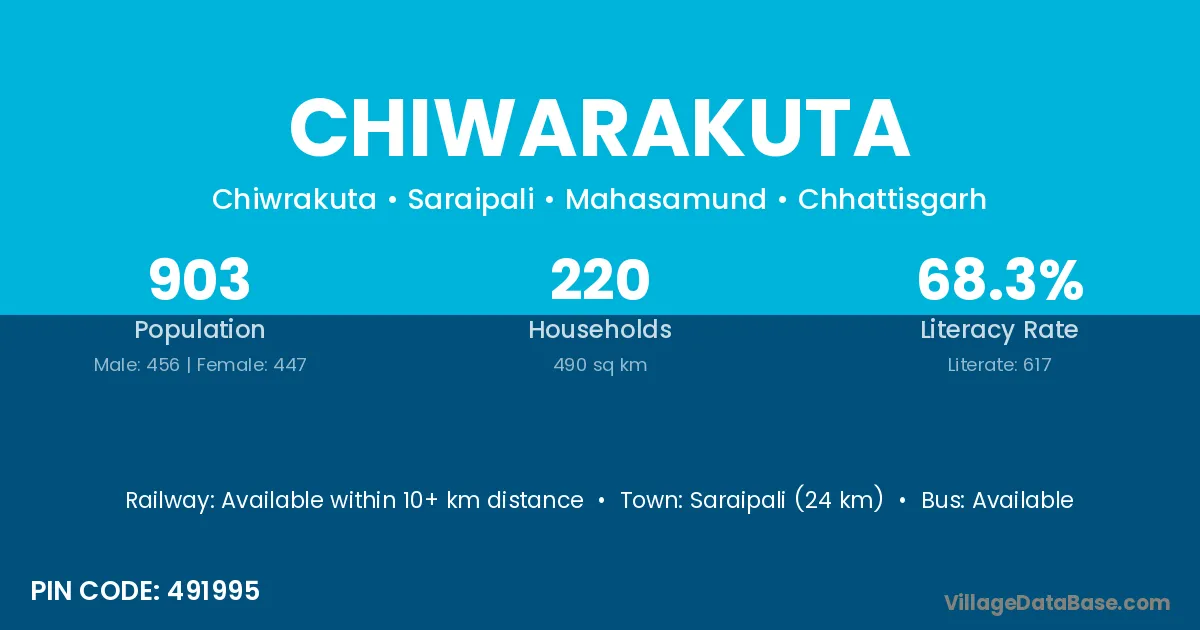 Saraipali (24 km) is the nearest town to Chiwarakuta village for major economic activities and is located approximately 24 km away.