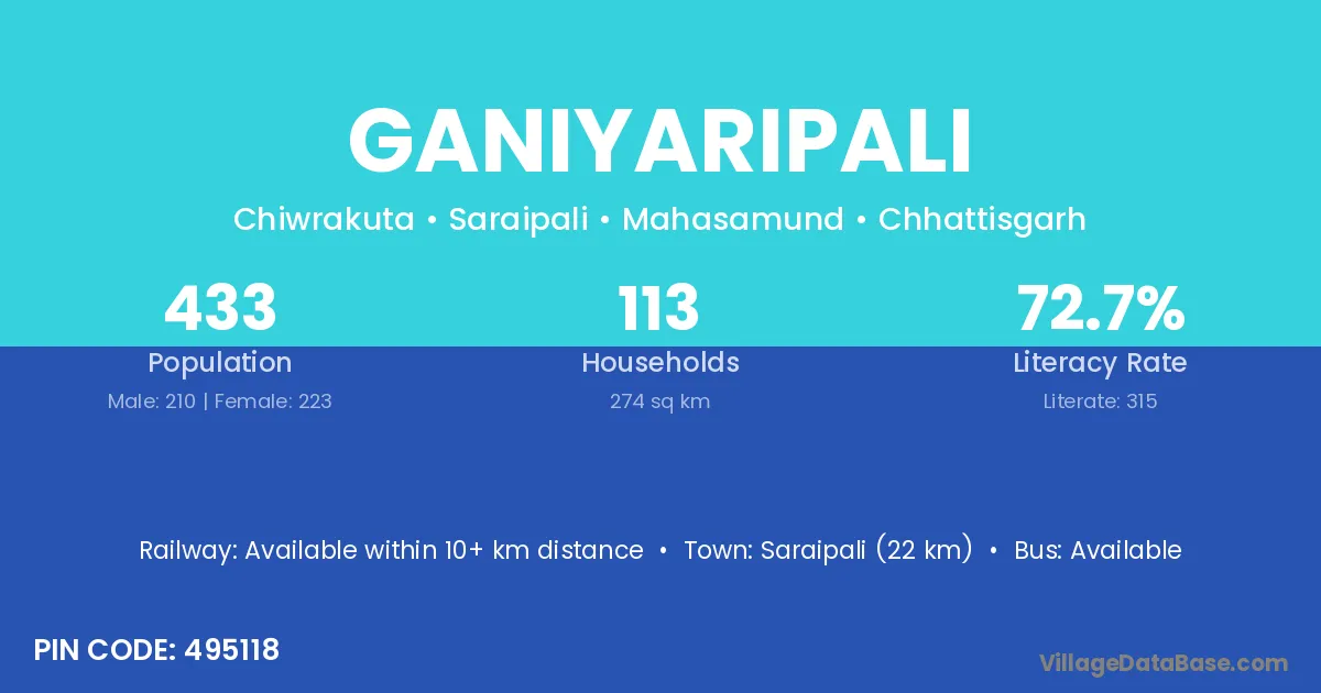 Saraipali (22 km) is the nearest town to Ganiyaripali village for major economic activities and is located approximately 22 km away.