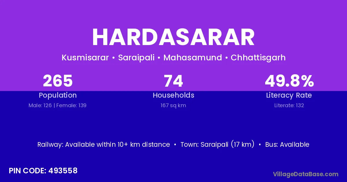 Saraipali (17 km) is the nearest town to Hardasarar village for major economic activities and is located approximately 17 km away.