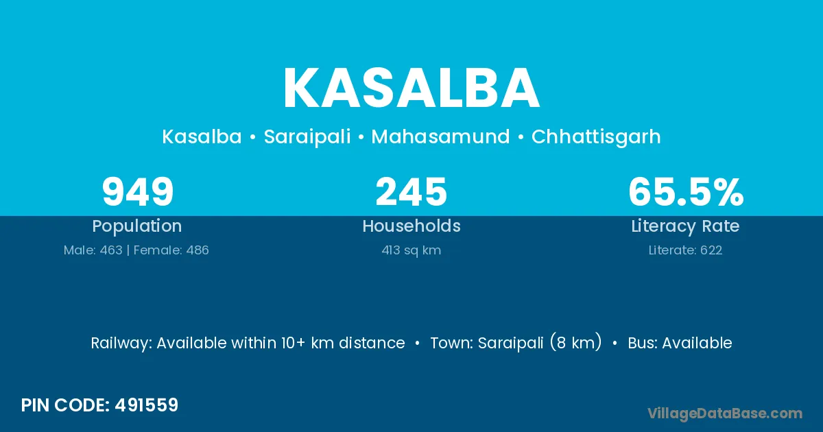 Saraipali (8 km) is the nearest town to Kasalba village for major economic activities and is located approximately 8 km away.