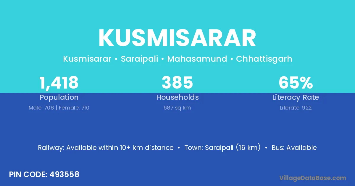 Saraipali (16 km) is the nearest town to Kusmisarar village for major economic activities and is located approximately 16 km away.