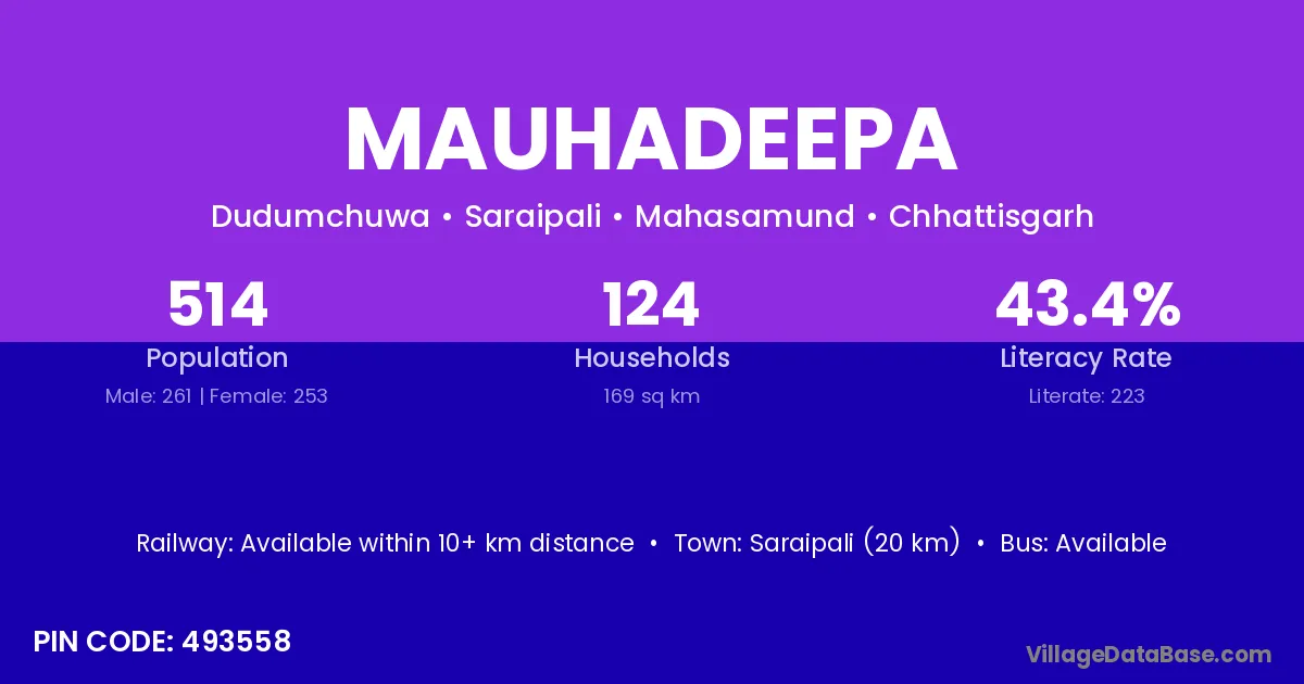 Saraipali (20 km) is the nearest town to Mauhadeepa village for major economic activities and is located approximately 20 km away.