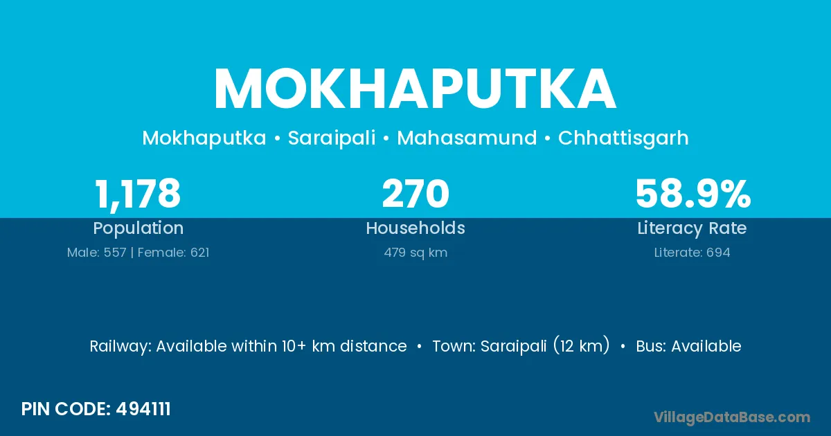 Saraipali (12 km) is the nearest town to Mokhaputka village for major economic activities and is located approximately 12 km away.
