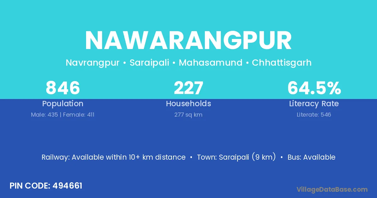 Nawarangpur village has a total population of 846 people, of which 435 are males and 411 are females.