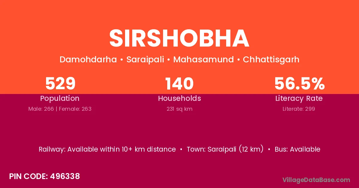 Saraipali (12 km) is the nearest town to Sirshobha village for major economic activities and is located approximately 12 km away.
