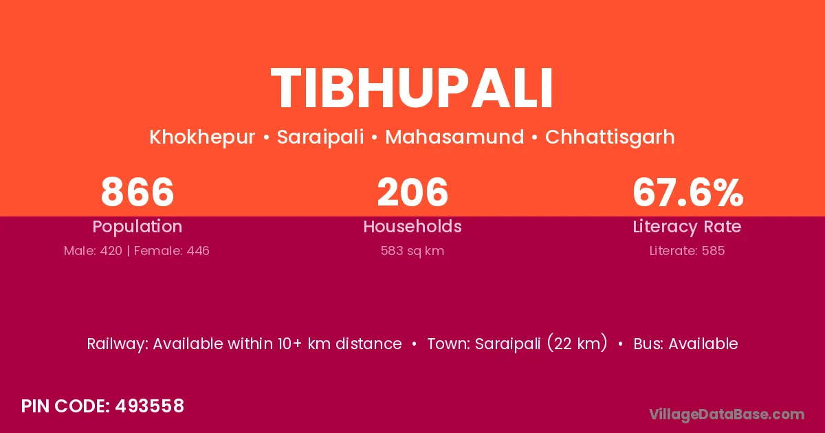 Tibhupali village has a total population of 866 people, of which 420 are males and 446 are females.
