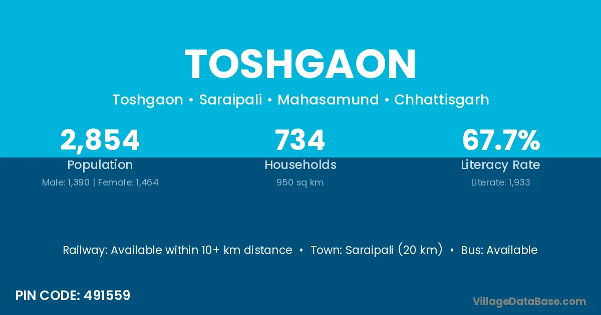 Saraipali (20 km) is the nearest town to Toshgaon village for major economic activities and is located approximately 20 km away.
