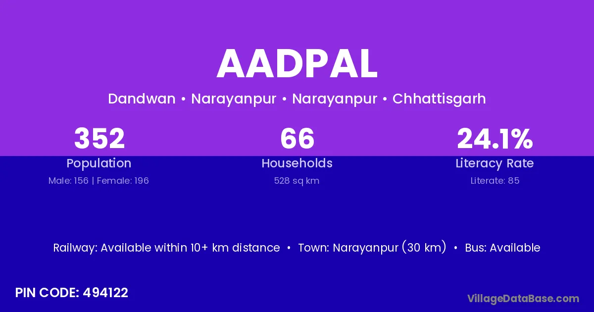 Narayanpur (30 km) is the nearest town to Aadpal village for major economic activities and is located approximately 30 km away.