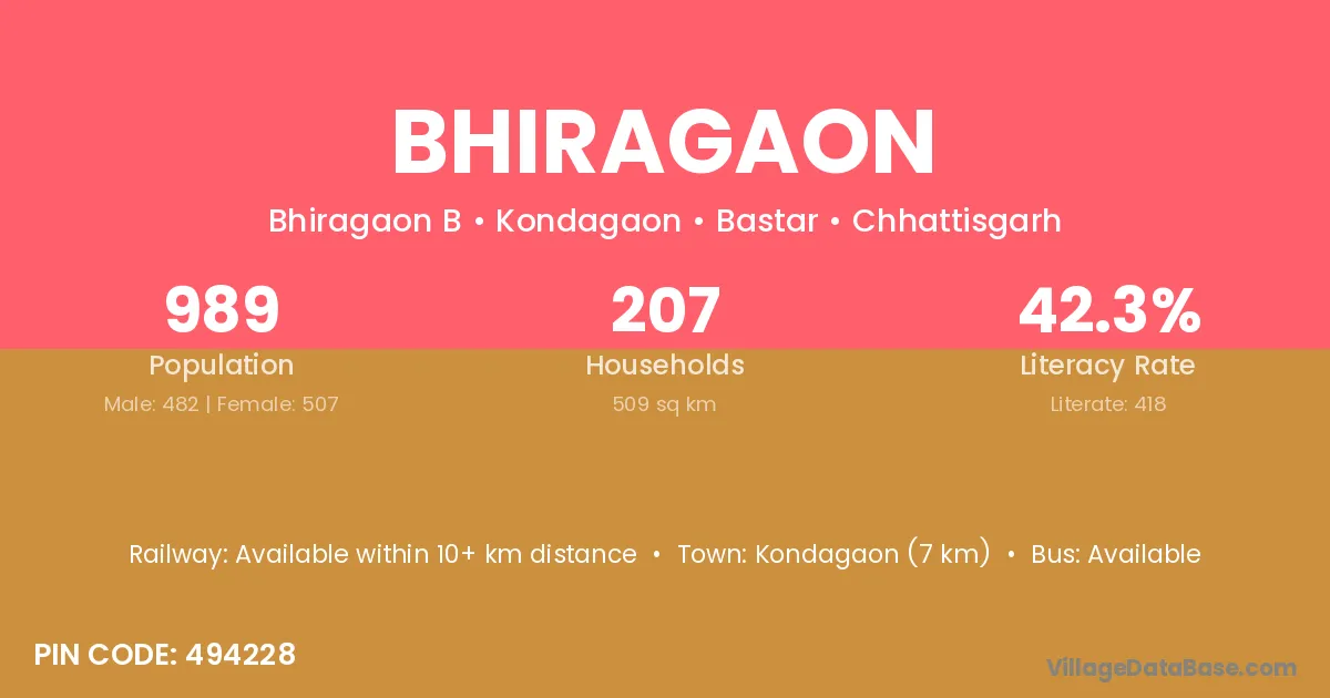 Narayanpur (25 km) is the nearest town to Bhiragaon village for major economic activities and is located approximately 25 km away.
