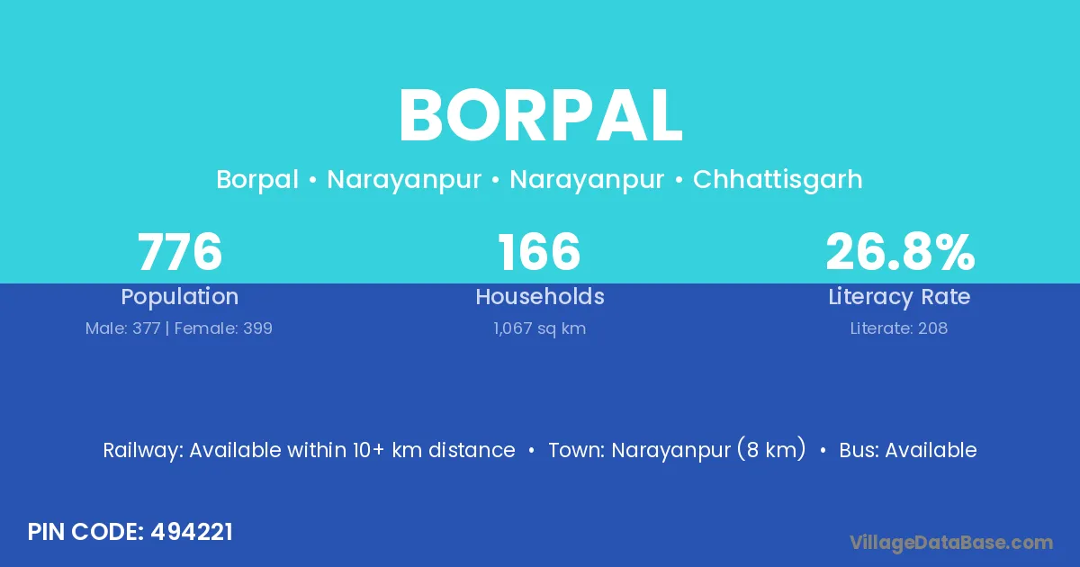 Narayanpur (8 km) is the nearest town to Borpal village for major economic activities and is located approximately 8 km away.