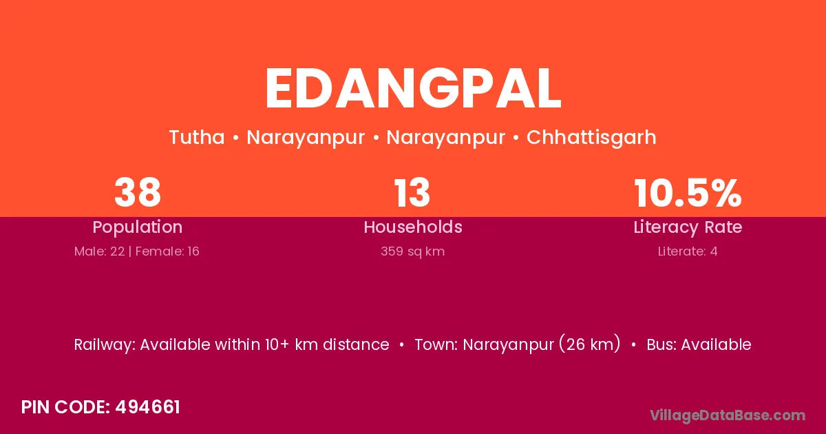 Narayanpur (26 km) is the nearest town to Edangpal village for major economic activities and is located approximately 26 km away.