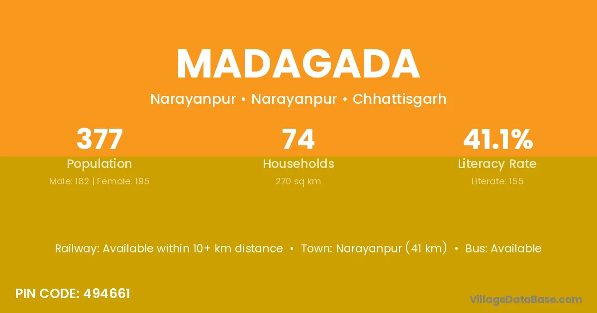 Narayanpur (41 km) is the nearest town to Madagada village for major economic activities and is located approximately 41 km away.