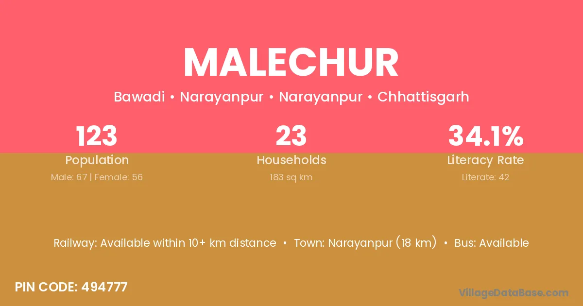 Narayanpur (18 km) is the nearest town to Malechur village for major economic activities and is located approximately 18 km away.