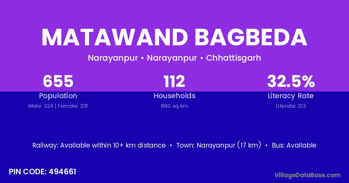 Narayanpur (17 km) is the nearest town to Matawand Bagbeda village for major economic activities and is located approximately 17 km away.