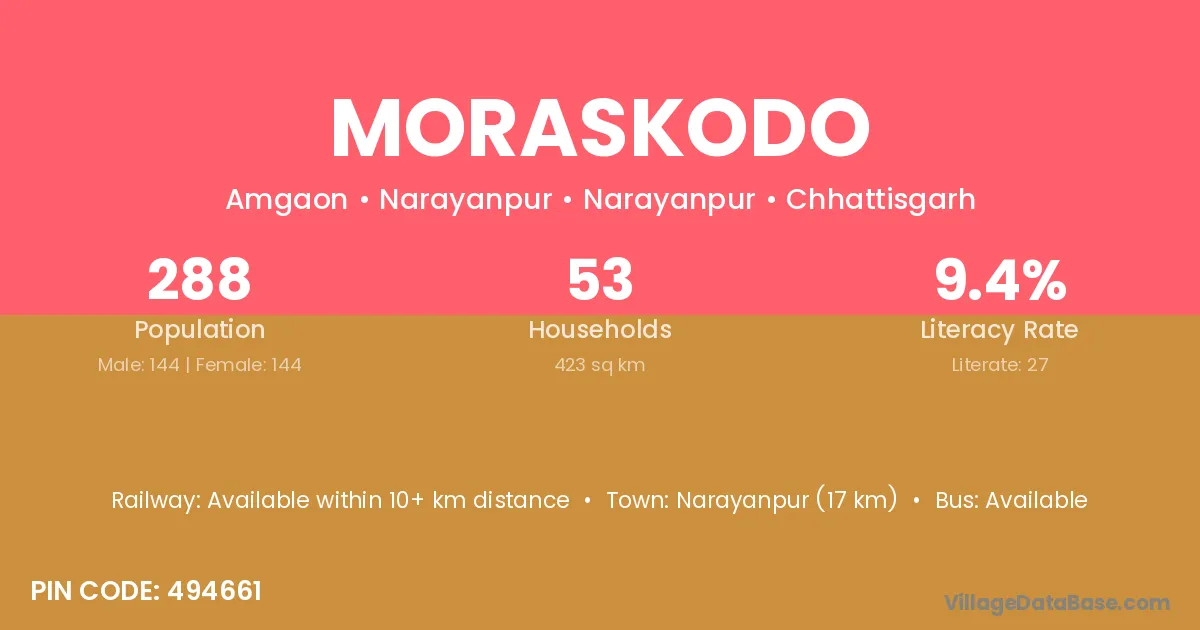 Narayanpur (17 km) is the nearest town to Moraskodo village for major economic activities and is located approximately 17 km away.