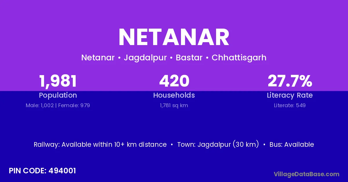 Narayanpur (38 km) is the nearest town to Netanar village for major economic activities and is located approximately 38 km away.