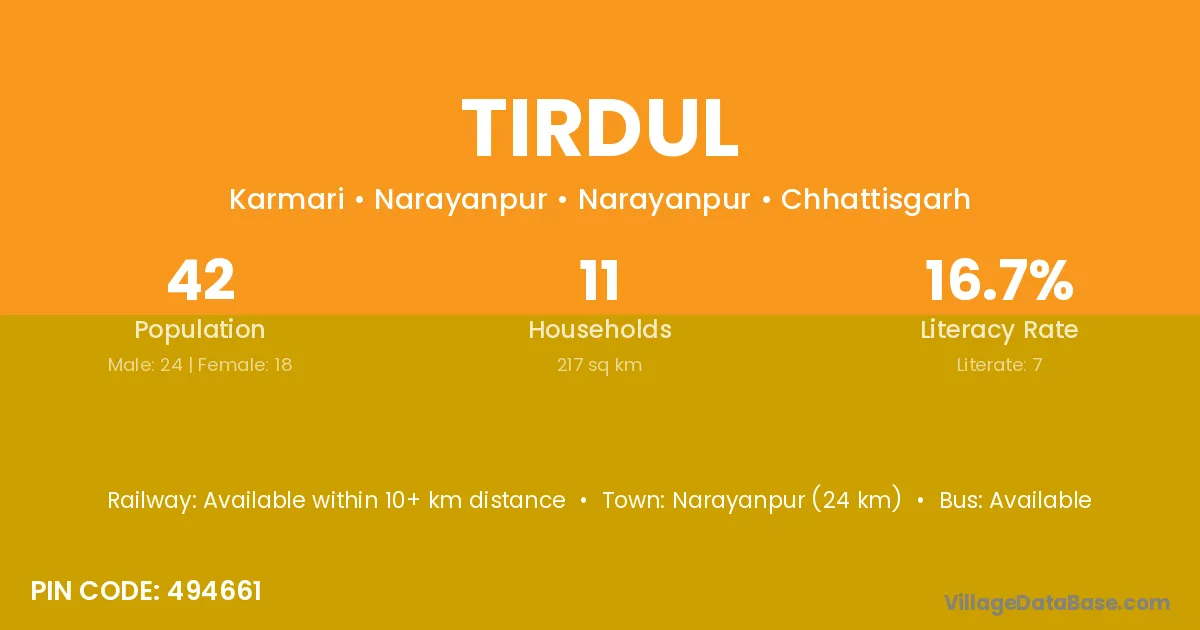 Narayanpur (24 km) is the nearest town to Tirdul village for major economic activities and is located approximately 24 km away.