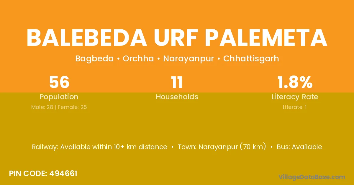 Balebeda Urf Palemeta village has a total population of 56 people, of which 28 are males and 28 are females.