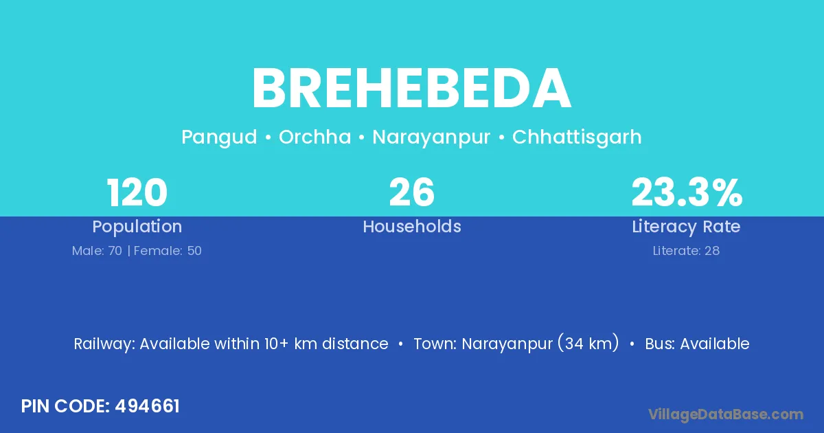Brehebeda village has a total population of 120 people, of which 70 are males and 50 are females.