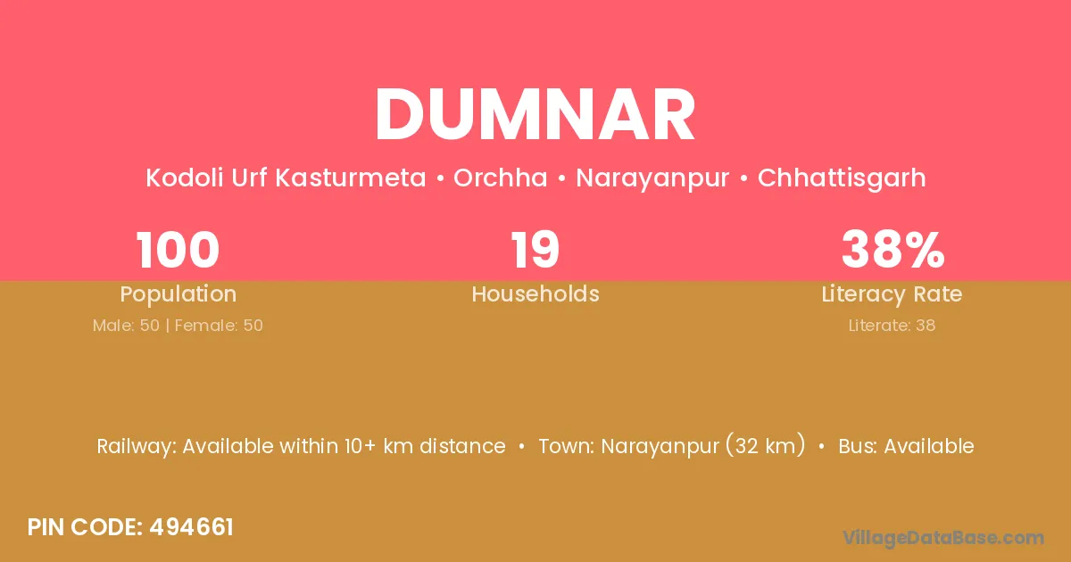Narayanpur (32 km) is the nearest town to Dumnar village for major economic activities and is located approximately 32 km away.