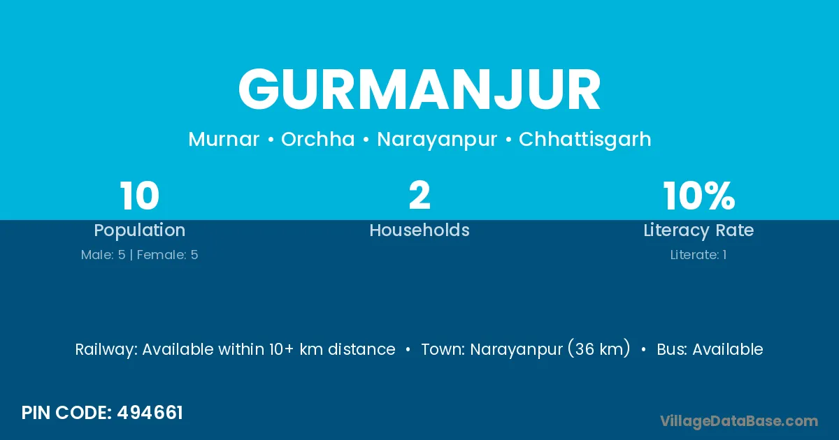 Narayanpur (36 km) is the nearest town to Gurmanjur village for major economic activities and is located approximately 36 km away.