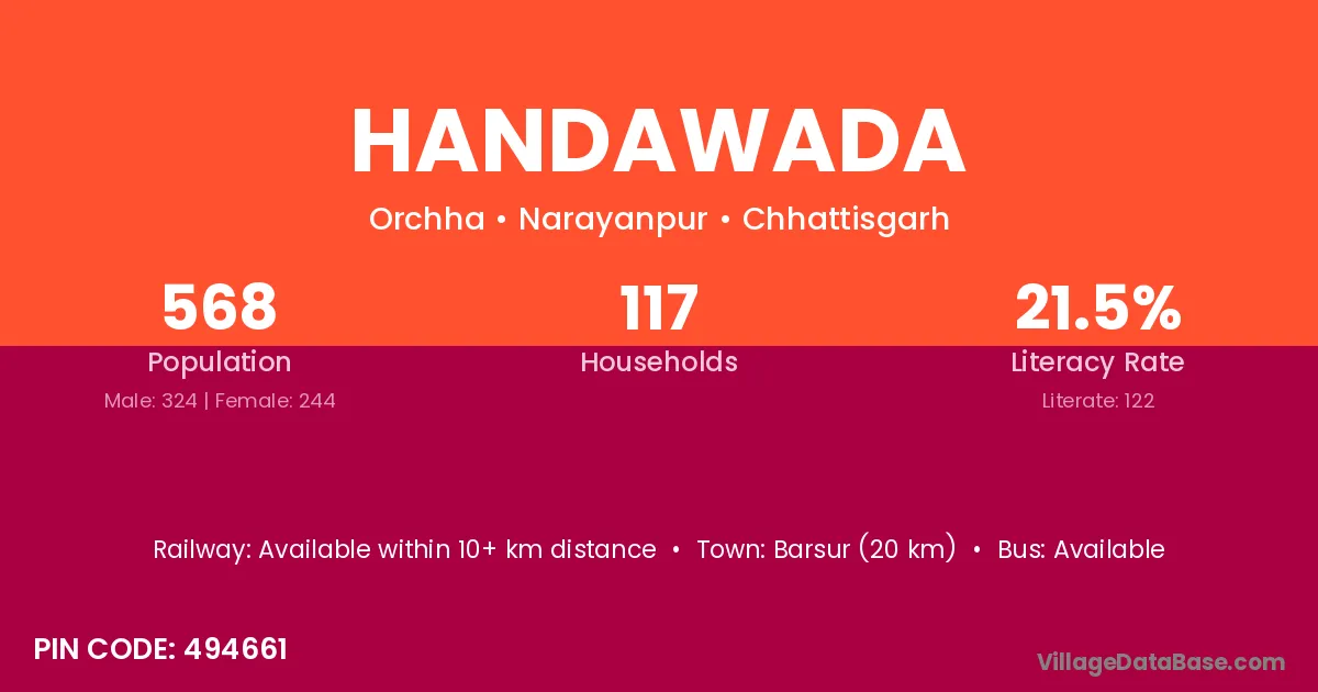 Barsur (20 km) is the nearest town to Handawada village for major economic activities and is located approximately 20 km away.
