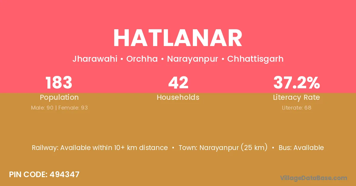 Narayanpur (25 km) is the nearest town to Hatlanar village for major economic activities and is located approximately 25 km away.