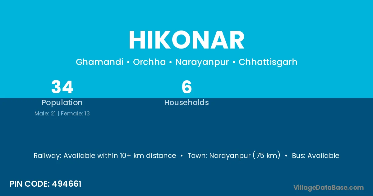 Narayanpur (75 km) is the nearest town to Hikonar village for major economic activities and is located approximately 75 km away.